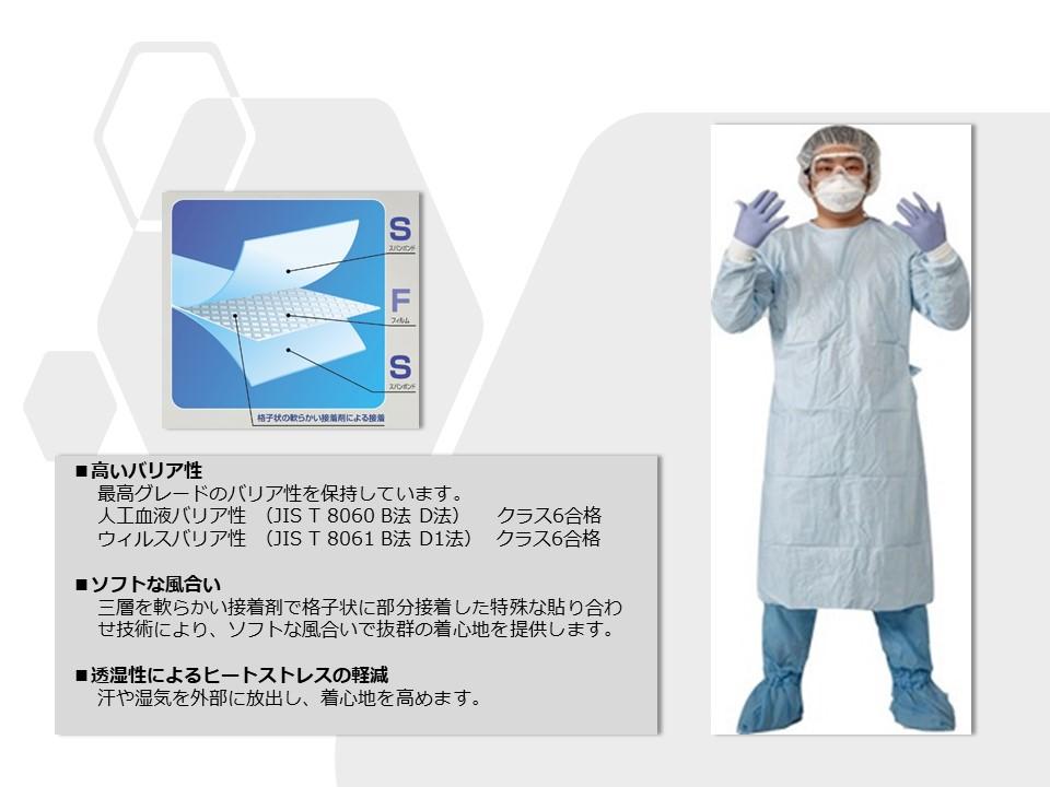 ◆ 生地は三層構造のSFSを採用。手術用ガウンよりも優れたバリア性能