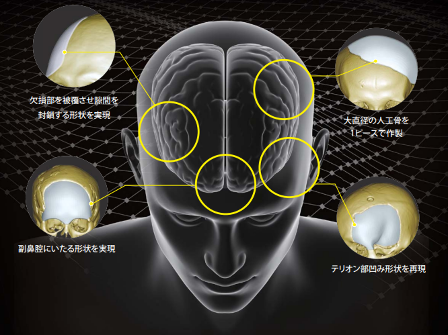 SKULPIO(スカルピオ)は、CT画像データを基に製作されるカスタムメイドの頭蓋骨用人工骨です。人工骨インプラントとして承認されており、頭蓋骨欠損部の形態的修復および固定を目的として使用されます。
